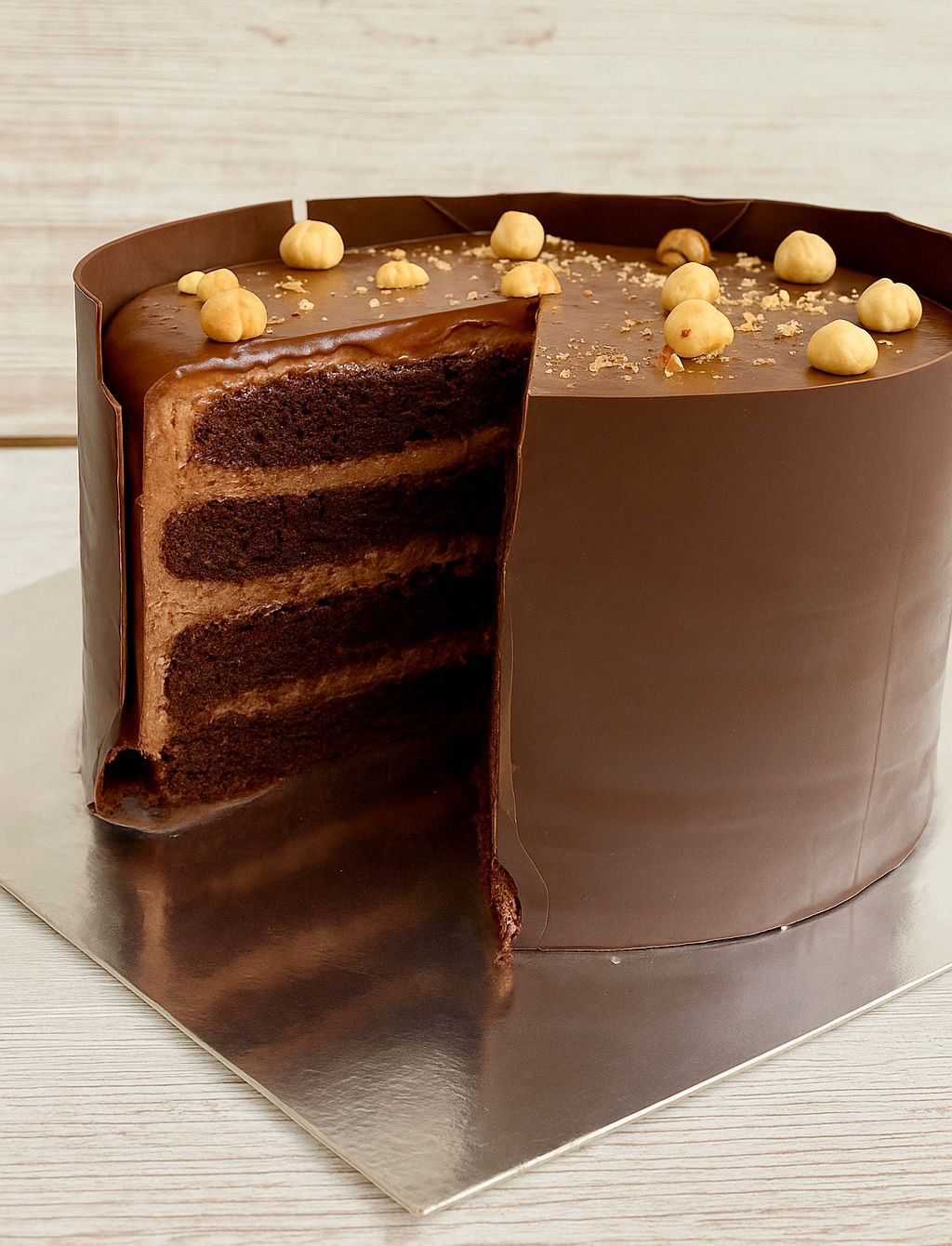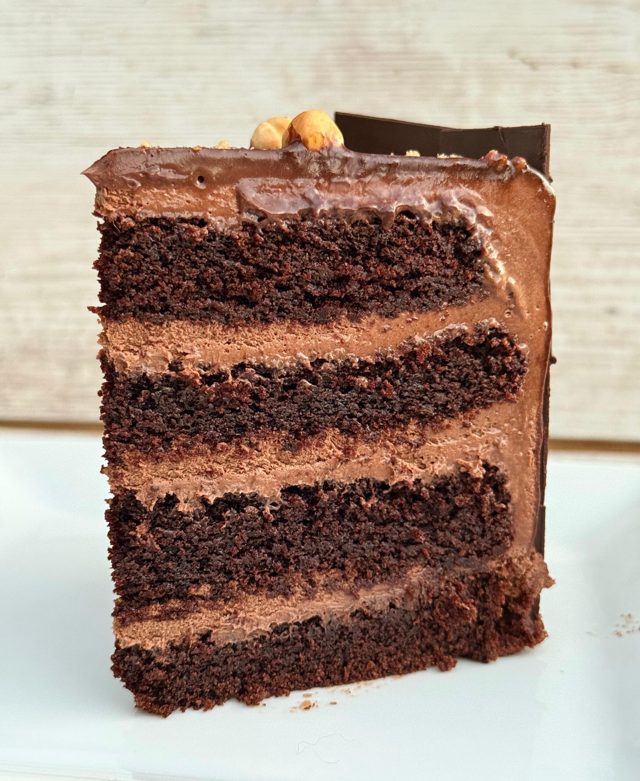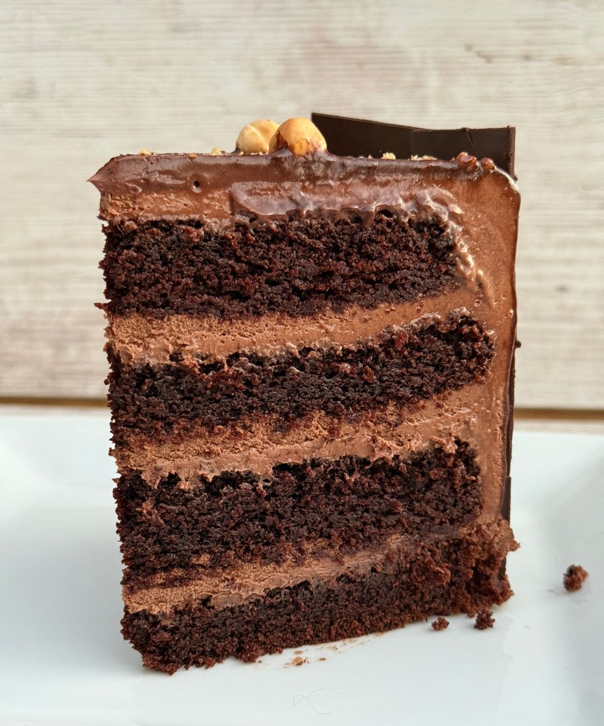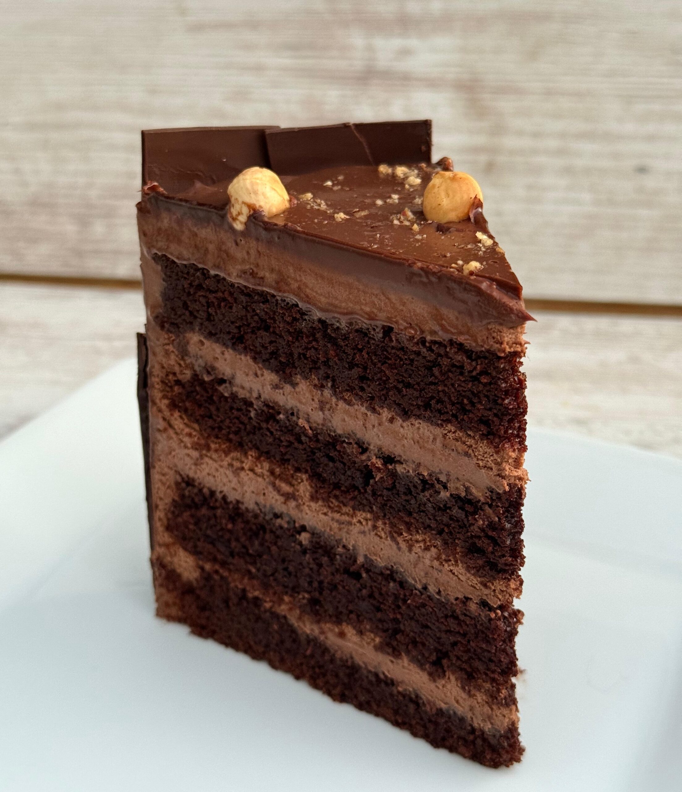 Bizcocho extra húmedo de chocolate, relleno con mousse de chocolate y bañada en más chocolate.
